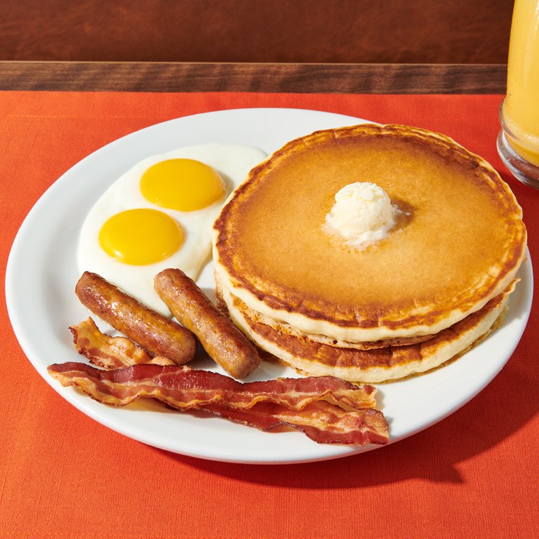 Two buttermilk pancakes served with eggs,* bacon strips and sausage links