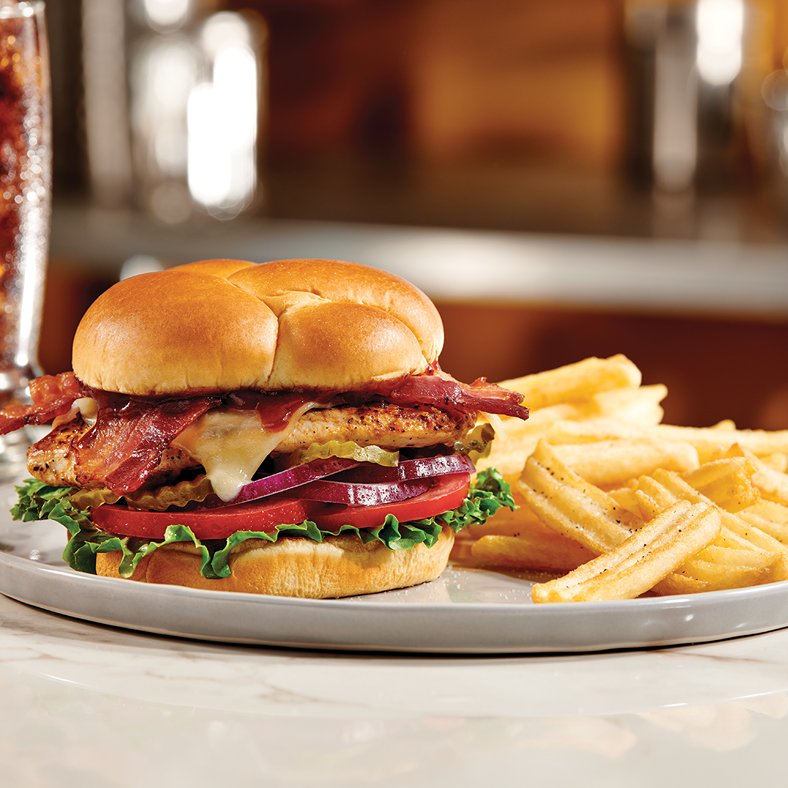This new creation is already a classic. Grilled chicken breast topped with BBQ sauce, two strips of bacon, aged white cheddar cheese, lettuce, tomato, red onions and sliced pickles on a grilled brioche bun.