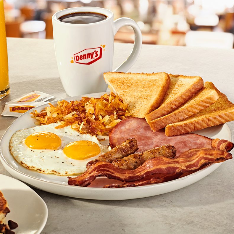Buttermilk pancakes, grilled ham, bacon strips, sausage links, eggs*, hash browns and choice of bread